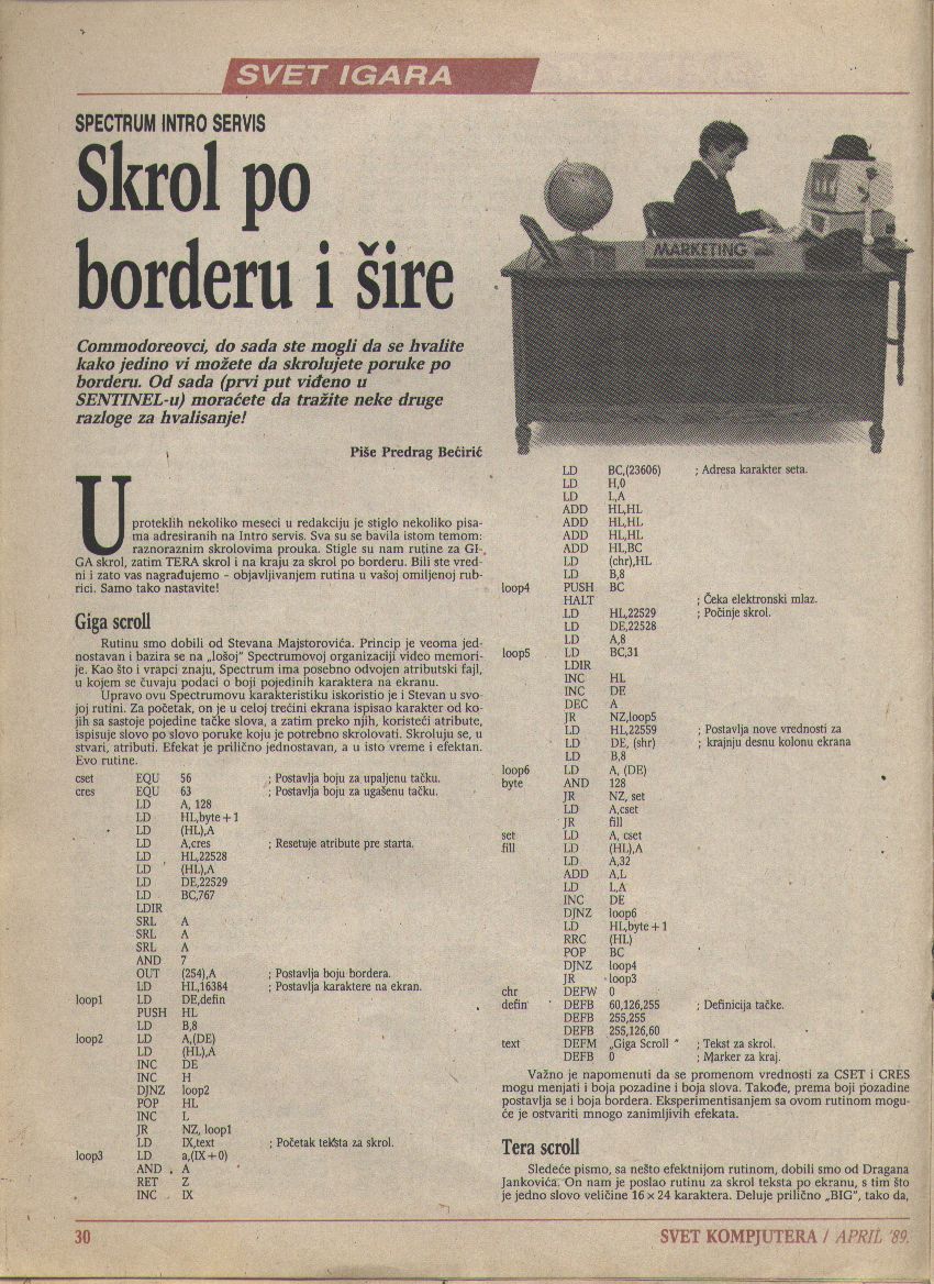 Igra je pisana kombinovano, delom u standardnom ZX Spectrum BASIC-u, a delom u mašinskom kodu, odnosno Z80 asembleru. Jedan od detalja koji je čine neobičnom (nigde nisam video takvu upotrebu z80 interapta) jeste bela kockica, odnosno tačka, koja se kreće s leva na desno red po red. Zamišljena je kao elektronski mlaz koji je kod tadašnjih CRT televizora zapravo iscrtavao sliku na ekranu. U samoj igri taj "mlaz" postaje prepreka koju igrač mora da izbegava.